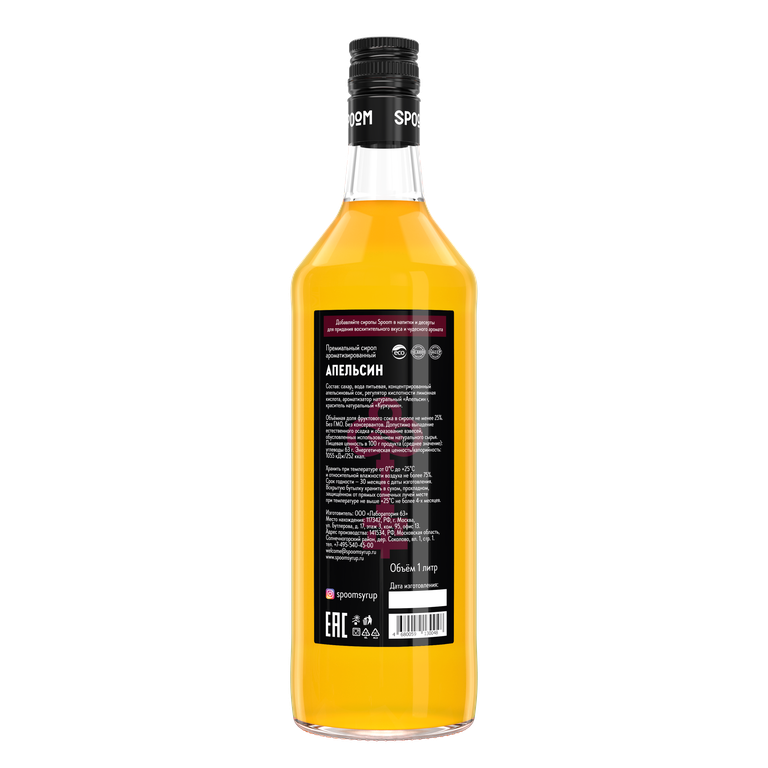 | Сахар, вода питьевая, концентрированный апельсиновый сок, регулятор кислотности лимонная кислота, натуральный ароматизатор «Апельсин», натуральный краситель «Куркумин»; Объёмная доля фруктового сока в сиропе не менее 25%; |