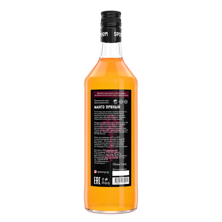| Сахар, вода питьевая, концентрированный сок манго, регулятор кислотности лимонная кислота, натуральный ароматизатор «Манго», натуральный экстракт красного острого перца, натуральные красители «Куркумин», «Карамельный колер», пищевой замутнитель растительного происхождения; Объёмная доля фруктового сока в сиропе не менее 25% |