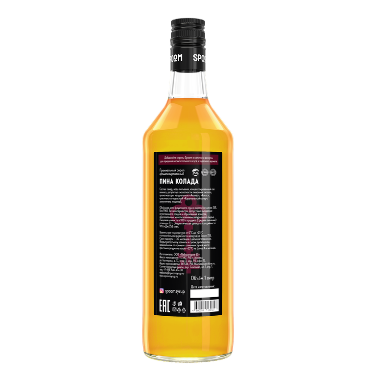 | Сироп Spoom Пина колада имеет сбалансированный аромат ананаса, кокосового ореха и вкус спелого ананаса с нотами кокосовой стружки. Может использоваться для создания безалкогольной версии одноименного коктейля или применяться в сочетании с алкоголем, а также для приготовления фруктовых пуншей, лимонадов, смузи, холодного и горячего чая. |
