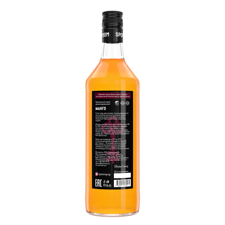 | Сахар, вода питьевая, концентрированный сок манго, регулятор кислотности лимонная кислота, натуральный ароматизатор «Манго», натуральный краситель «Карамельный колер», пищевой замутнитель растительного происхождения; Объёмная доля фруктового сока в сиропе не менее 25% |