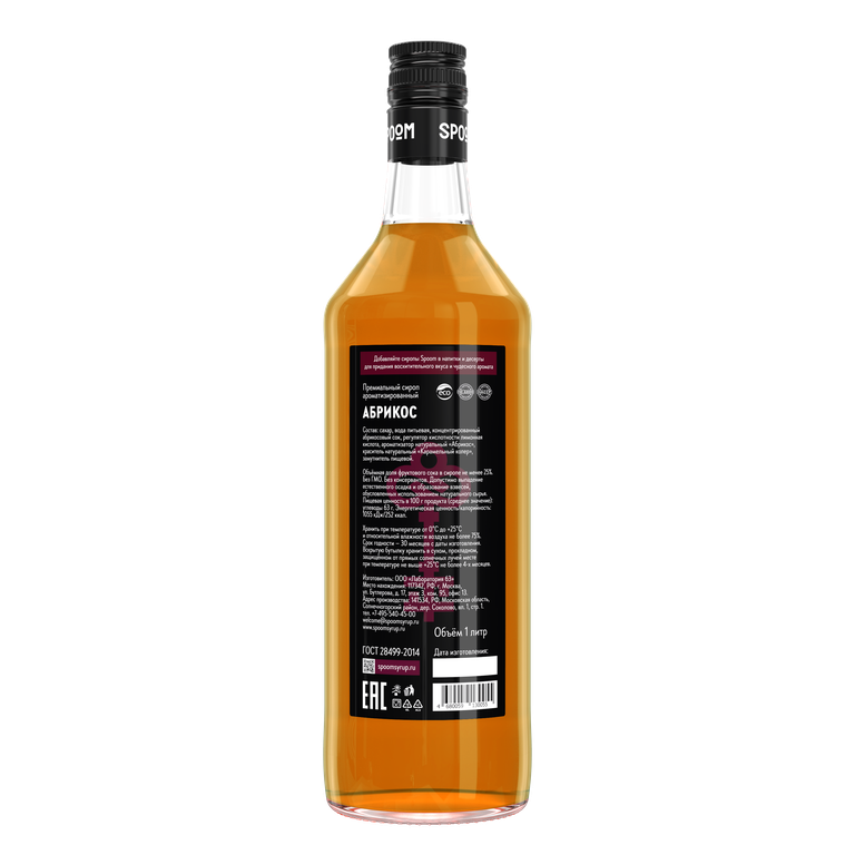 | Сахар, вода питьевая, концентрированный абрикосовый сок, регулятор кислотности лимонная кислота, натуральный ароматизатор «Абрикос», натуральный краситель «Карамельный колер», замутнитель пищевой; Объёмная доля фруктового сока в сиропе не менее 25%; |