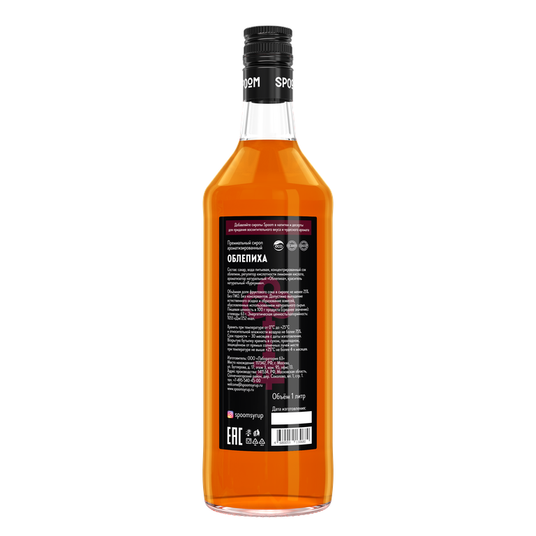| Сахар, вода питьевая, концентрированный сок облепихи, регулятор кислотности лимонная кислота, натуральный ароматизатор «Облепиха», натуральный краситель «Куркумин»; Объёмная доля фруктового сока в сиропе не менее 25% |