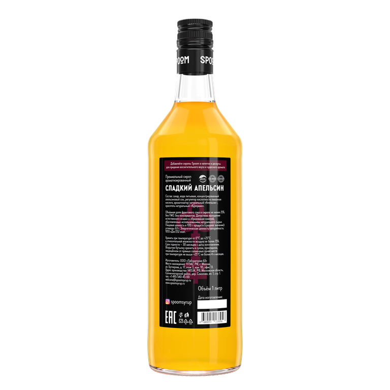 | Сахар, вода питьевая, концентрированный апельсиновый сок, регулятор кислотности лимонная кислота, натуральный ароматизатор «Апельсин», натуральный краситель «Куркумин»; Объёмная доля фруктового сока в сиропе не менее 25% |